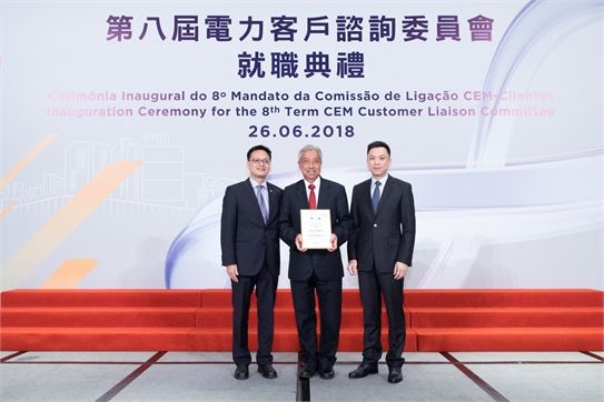 Companhia de Electricidade de Macau - CEM, S.A. (CEM) held its Inauguration Ceremony for the 8th Term of CEM Customer Liaison Committee (CLC) at the JW Marriott Hotel Macau in the evening on 26 June 2018. Guests attending the Inauguration Ceremony included Samio Lou, Deputy Director of Office for the Development of the Energy Sector, Iu Iu Cheong, Former CLC President, Vong Kok Seng, CLC President, Lei Chi Fong and Iun Iok Meng, CLC Vice Presidents, presidents and representatives of the local associations participating in the CLC, CLC members, as well as Bernie Leong, CEM Executive Committee Chairman, Shi Yulin, CEM Executive Director and Benjamin Yue, Principal Advisor to CEM Executive Committee. Witnessed by the guests, Committee members of the new term were awarded certificates of nomination by Samio Lou and Bernie Leong.